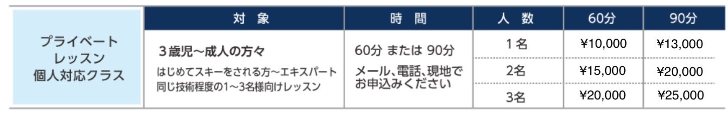 「プライベートレッスン希望」とご記載いただき、「希望日、時間帯(午前は12:30まで、午後は13:30から)、レッスン時間、人数、参加される方のお名前と年齢、スキーレベル」をお知らせください。
